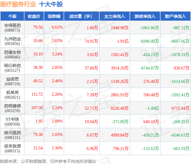 个股表现方面,医疗服务行业当日领涨股为毕得医药(688073),该股当日报收79.56,上涨6.61%,成交量1.8万,主力资金净流入1948.98万元。九洲药业(603456)以上涨5.65%紧随其后,该股当日成交量74.91万,主力资金净流入1.91亿元。除此之外,药康生物(688046)、昭衍新药(603127)、益诺思(688710)均进入当日牛股之列。具体个股列表见下表: