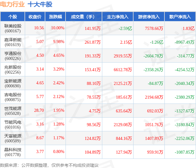 个股表现方面,电力行业当日领涨股为联美控股(600167),该股当日报收10.56,上涨10.0%,成交量141.95万,主力资金净流出2.59亿元。嘉泽新能(601619)以上涨9.98%紧随其后,该股当日成交量261.87万,主力资金净流入2.15亿元。除此之外,亨通股份(600226)、兆新股份(002256)、宝新能源(000690)均进入当日牛股之列。具体个股列表见下表: