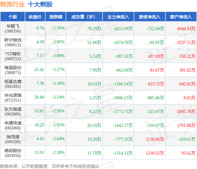 个股表现方面,物流行业当日领跌股为华鹏飞(300350),该股当日报收6.76,下跌5.59%,成交量70.29万,主力资金净流出4211.99万元。新宁物流(300013)以下跌3.91%紧随其后,该股当日成交量51.08万,主力资金净流出2474.59万元。除此之外,*ST海钦(600753)、海晨股份(300873)、恒基达鑫(002492)均进入当日熊股之列。具体个股列表见下表: