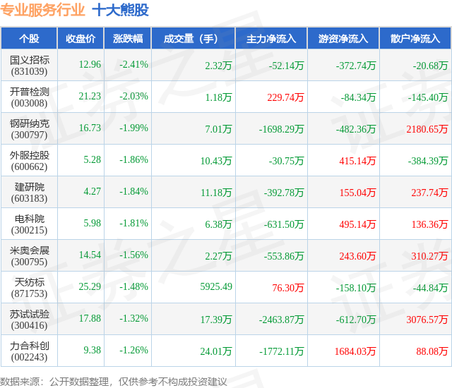 个股表现方面,专业服务行业当日领跌股为国义招标(831039),该股当日报收12.96,下跌2.41%,成交量2.32万,主力资金净流出52.14万元。开普检测(003008)以下跌2.03%紧随其后,该股当日成交量1.18万,主力资金净流入229.74万元。除此之外,钢研纳克(300797)、外服控股(600662)、建研院(603183)均进入当日熊股之列。具体个股列表见下表: