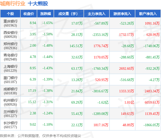 个股表现方面,城商行行业当日领跌股为重庆银行(601963),该股当日报收8.94,下跌1.65%,成交量17.07万,主力资金净流出567.89万元。西安银行(600928)以下跌1.5%紧随其后,该股当日成交量28.15万,主力资金净流出2353.16万元。除此之外,郑州银行(002936)、青岛银行(002948)、上海银行(601229)均进入当日熊股之列。具体个股列表见下表: