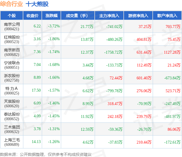 个股表现方面,综合行业当日领跌股为南京公用(000421),该股当日报收6.22,下跌3.72%,成交量21.77万,主力资金净流出741.02万元。红棉股份(000523)以下跌1.86%紧随其后,该股当日成交量13.87万,主力资金净流出480.26万元。除此之外,南京新百(600682)、宁波联合(600051)、浙农股份(002758)均进入当日熊股之列。具体个股列表见下表: