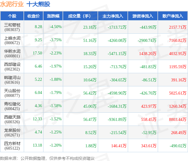 个股表现方面,水泥行业当日领跌股为三和管桩(003037),该股当日报收8.28,下跌4.5%,成交量23.18万,主力资金净流出1713.72万元。上峰水泥(000672)以下跌3.75%紧随其后,该股当日成交量51.16万,主力资金净流出4260.08万元。除此之外,华新水泥(600801)、西部建设(002302)、韩建河山(603616)均进入当日熊股之列。具体个股列表见下表: