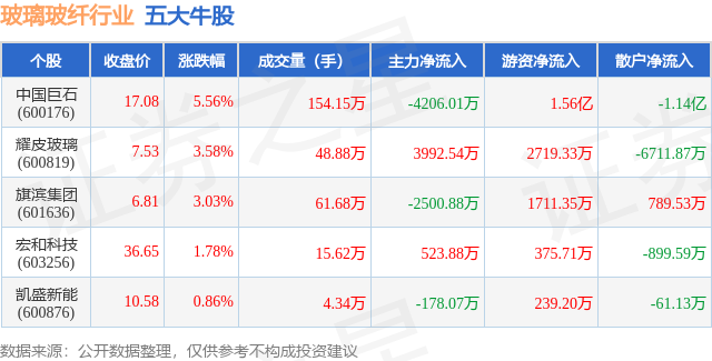 个股表现方面,玻璃玻纤行业当日领涨股为中国巨石(600176),该股当日报收17.08,上涨5.56%,成交量154.15万,主力资金净流出4206.01万元。耀皮玻璃(600819)以上涨3.58%紧随其后,该股当日成交量48.88万,主力资金净流入3992.54万元。除此之外,旗滨集团(601636)、宏和科技(603256)、凯盛新能(600876)均进入当日牛股之列。具体个股列表见下表: