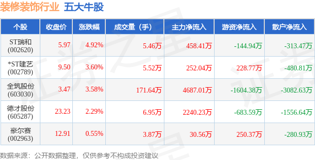 个股表现方面,装修装饰行业当日领涨股为ST瑞和(002620),该股当日报收5.97,上涨4.92%,成交量5.46万,主力资金净流入458.41万元。*ST建艺(002789)以上涨3.6%紧随其后,该股当日成交量5.52万,主力资金净流入252.04万元。除此之外,全筑股份(603030)、德才股份(605287)、豪尔赛(002963)均进入当日牛股之列。具体个股列表见下表: