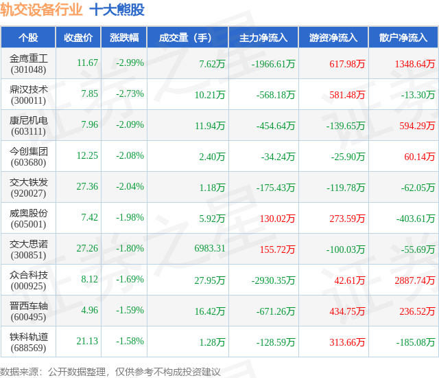个股表现方面,轨交设备行业当日领跌股为金鹰重工(301048),该股当日报收11.67,下跌2.99%,成交量7.62万,主力资金净流出1966.61万元。鼎汉技术(300011)以下跌2.73%紧随其后,该股当日成交量10.21万,主力资金净流出568.18万元。除此之外,康尼机电(603111)、今创集团(603680)、交大铁发(920027)均进入当日熊股之列。具体个股列表见下表: