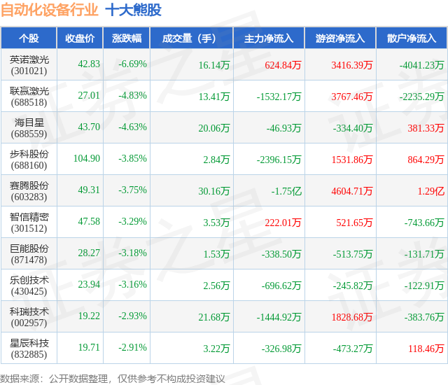 个股表现方面,自动化设备行业当日领跌股为英诺激光(301021),该股当日报收42.83,下跌6.69%,成交量16.14万,主力资金净流入624.84万元。联赢激光(688518)以下跌4.83%紧随其后,该股当日成交量13.41万,主力资金净流出1532.17万元。除此之外,海目星(688559)、步科股份(688160)、赛腾股份(603283)均进入当日熊股之列。具体个股列表见下表: