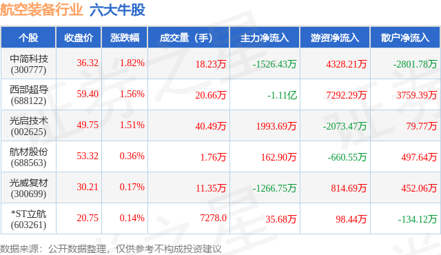 个股表现方面,航空装备行业当日领涨股为中简科技(300777),该股当日报收36.32,上涨1.82%,成交量18.23万,主力资金净流出1526.43万元。西部超导(688122)以上涨1.56%紧随其后,该股当日成交量20.66万,主力资金净流出1.11亿元。除此之外,光启技术(002625)、航材股份(688563)、光威复材(300699)均进入当日牛股之列。具体个股列表见下表: