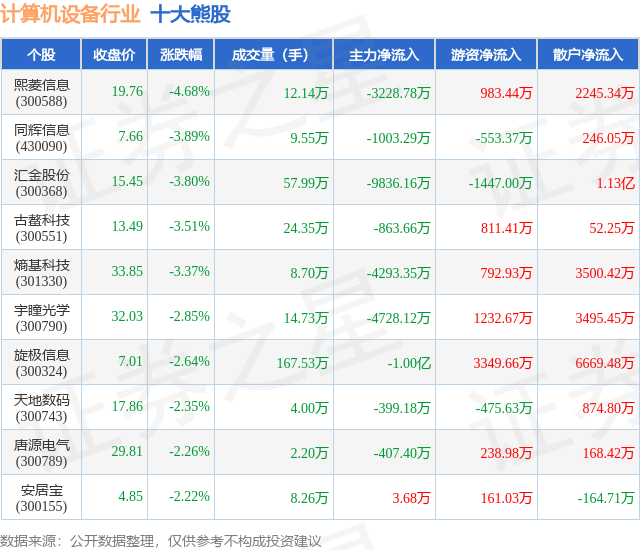 个股表现方面,计算机设备行业当日领跌股为熙菱信息(300588),该股当日报收19.76,下跌4.68%,成交量12.14万,主力资金净流出3228.78万元。同辉信息(430090)以下跌3.89%紧随其后,该股当日成交量9.55万,主力资金净流出1003.29万元。除此之外,汇金股份(300368)、古鳌科技(300551)、熵基科技(301330)均进入当日熊股之列。具体个股列表见下表: