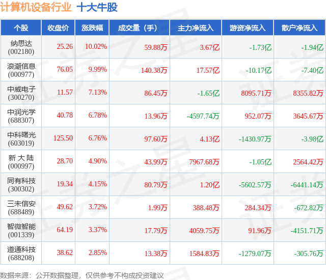 个股表现方面,计算机设备行业当日领涨股为纳思达(002180),该股当日报收25.26,上涨10.02%,成交量59.88万,主力资金净流入3.67亿元。浪潮信息(000977)以上涨9.99%紧随其后,该股当日成交量140.38万,主力资金净流入17.57亿元。除此之外,中威电子(300270)、中润光学(688307)、中科曙光(603019)均进入当日牛股之列。具体个股列表见下表: