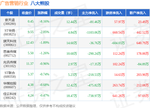 个股表现方面,广告营销行业当日领跌股为紫天退(300280),该股当日报收0.45,下跌8.16%,成交量12.44万,主力资金净流出81.46万元。ST华扬(603825)以下跌2.05%紧随其后,该股当日成交量4.84万,主力资金净流出1103.06万元。除此之外,旗天科技(300061)、思美传媒(002712)、兆讯传媒(301102)均进入当日熊股之列。具体个股列表见下表: