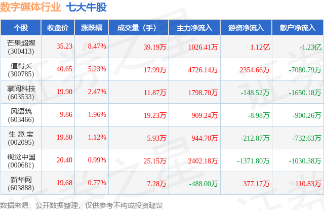 个股表现方面,数字媒体行业当日领涨股为芒果超媒(300413),该股当日报收35.23,上涨8.47%,成交量39.19万,主力资金净流入1026.41万元。值得买(300785)以上涨5.23%紧随其后,该股当日成交量17.99万,主力资金净流入4726.14万元。除此之外,掌阅科技(603533)、风语筑(603466)、生 意 宝(002095)均进入当日牛股之列。具体个股列表见下表: