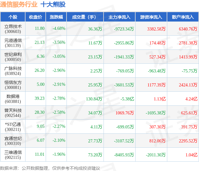 个股表现方面,通信服务行业当日领跌股为立昂技术(300603),该股当日报收11.8,下跌4.68%,成交量36.36万,主力资金净流出9723.34万元。元道通信(301139)以下跌3.56%紧随其后,该股当日成交量11.67万,主力资金净流出2955.86万元。除此之外,世纪鼎利(300050)、广脉科技(838924)、恒信东方(300081)均进入当日熊股之列。具体个股列表见下表:
