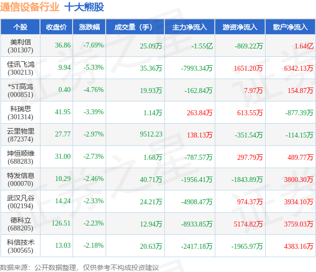 个股表现方面,通信设备行业当日领跌股为美利信(301307),该股当日报收36.86,下跌7.69%,成交量25.09万,主力资金净流出1.55亿元。佳讯飞鸿(300213)以下跌5.33%紧随其后,该股当日成交量35.36万,主力资金净流出7993.34万元。除此之外,*ST高鸿(000851)、科瑞思(301314)、云里物里(872374)均进入当日熊股之列。具体个股列表见下表: