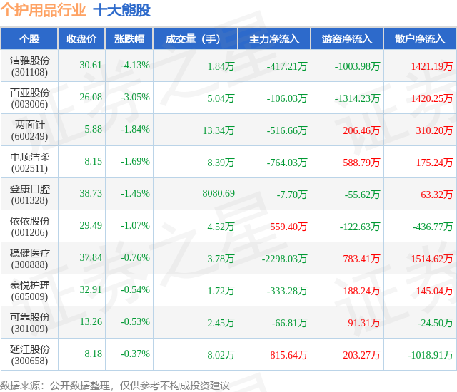 个股表现方面,个护用品行业当日领跌股为洁雅股份(301108),该股当日报收30.61,下跌4.13%,成交量1.84万,主力资金净流出417.21万元。百亚股份(003006)以下跌3.05%紧随其后,该股当日成交量5.04万,主力资金净流出106.03万元。除此之外,两面针(600249)、中顺洁柔(002511)、登康口腔(001328)均进入当日熊股之列。具体个股列表见下表: