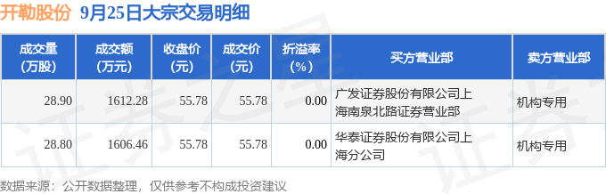 证券之星消息,9月25日开勒股份发生大宗交易,交易数据如下: