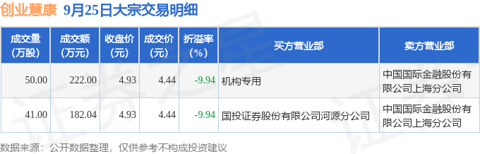 证券之星消息,9月25日创业慧康发生大宗交易,交易数据如下:
