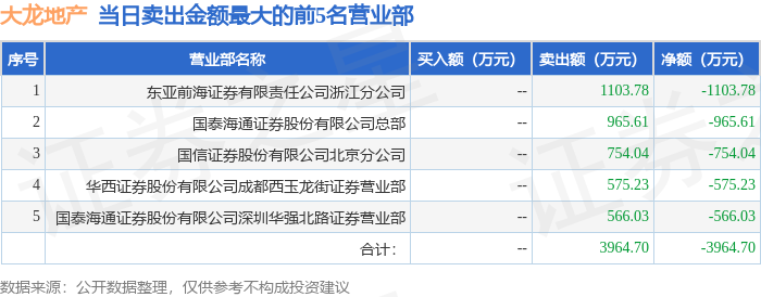 证券之星消息,沪深交易所2025年9月25日公布的交易公开信息显示,大龙地产(600159)因有价格涨跌幅限制的日收盘价格跌幅偏离值达到7%的前五只证券登上龙虎榜。此次是近5个交易日内第4次上榜。
