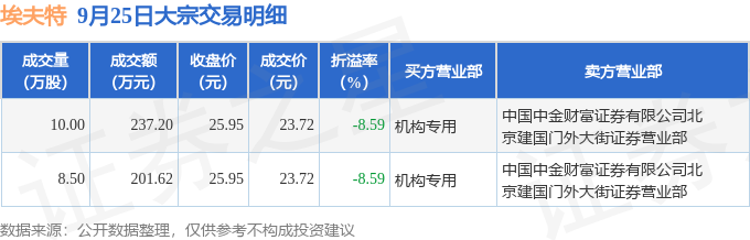 证券之星消息,9月25日埃夫特发生大宗交易,交易数据如下: