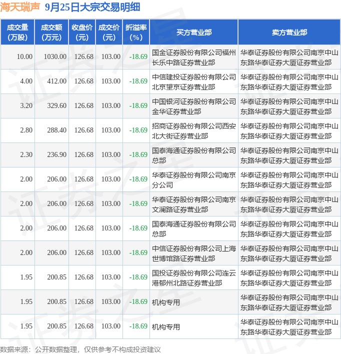 证券之星消息,9月25日海天瑞声发生大宗交易,交易数据如下: