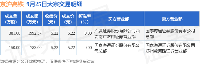 证券之星消息,9月25日京沪高铁发生大宗交易,交易数据如下: