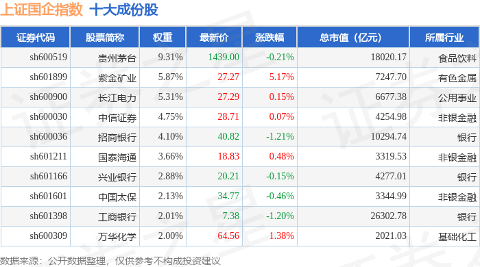 上证国企(000056)指数十大成份股详情如下: