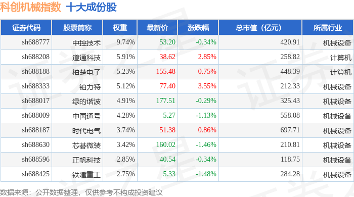 证券之星消息,9月25日,科创机械(000693)指数报收于1456.77点,跌0.68%,成交203.99亿元,换手率1.59%。当日该指数成份股中,上涨的有15家,铂力特以3.55%的涨幅领涨,下跌的有35家,杭可科技以7.74%的跌幅领跌。