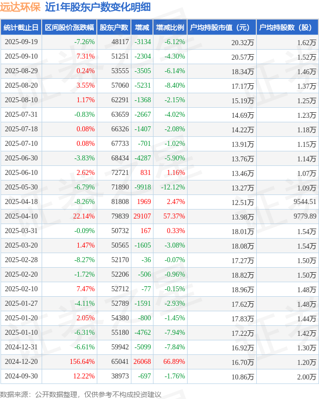 从股价来看,2025年9月10日至2025年9月19日,远达环保区间跌幅为7.26%,在此期间股东户数减少3134.0户,减幅为6.12%。