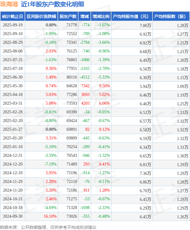 从股价来看,2025年9月10日至2025年9月19日,珠海港区间跌幅为0.0%,在此期间股东户数减少774.0户,减幅为1.07%。