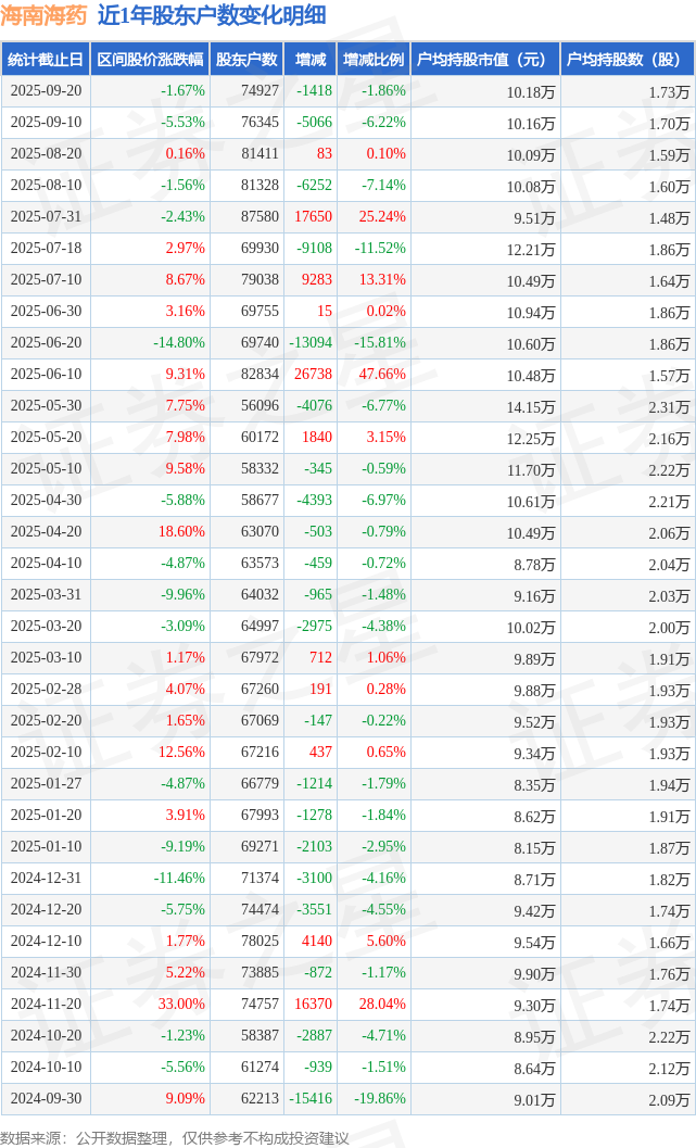 从股价来看,2025年9月10日至2025年9月20日,海南海药区间跌幅为1.67%,在此期间股东户数减少1418.0户,减幅为1.86%。