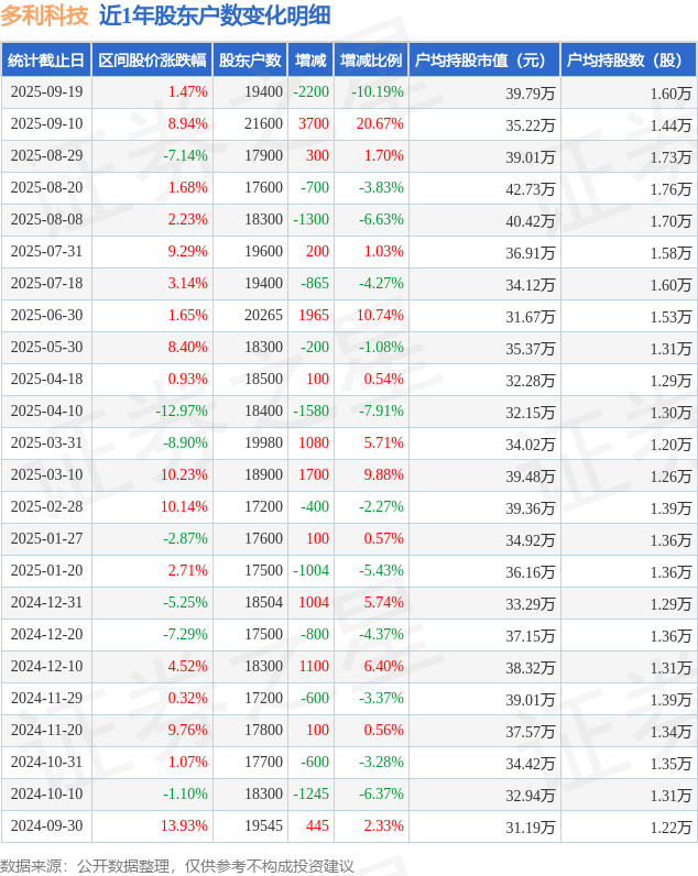 从股价来看,2025年9月10日至2025年9月19日,多利科技区间涨幅为1.47%,在此期间股东户数减少2200.0户,减幅为10.19%。