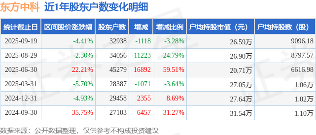 从股价来看,2025年8月29日至2025年9月19日,东方中科区间跌幅为4.41%,在此期间股东户数减少1118.0户,减幅为3.28%。