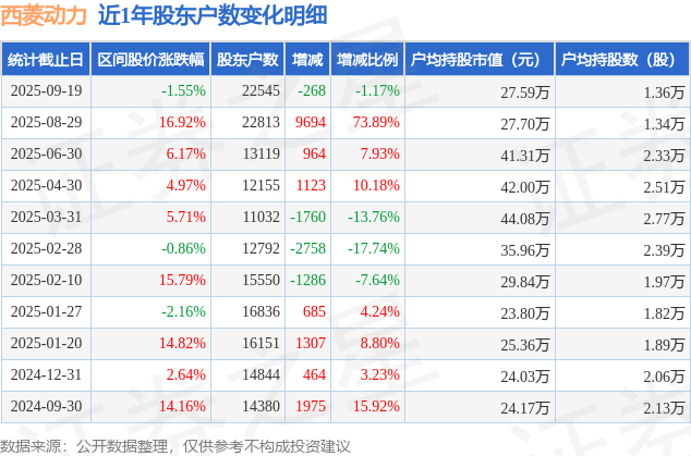 从股价来看,2025年8月29日至2025年9月19日,西菱动力区间跌幅为1.55%,在此期间股东户数减少268.0户,减幅为1.17%。