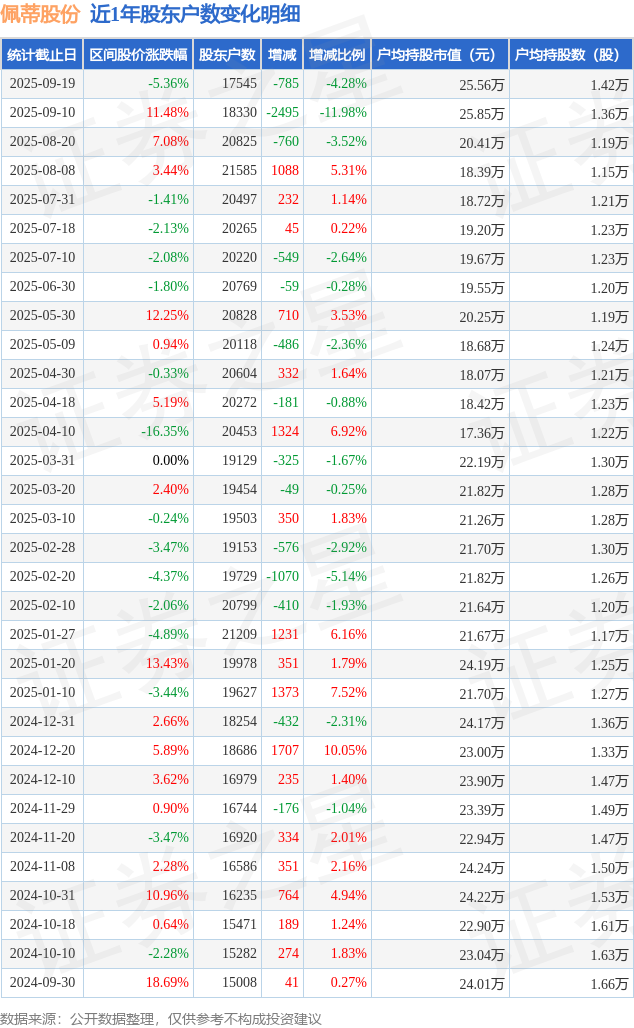 从股价来看,2025年9月10日至2025年9月19日,佩蒂股份区间跌幅为5.36%,在此期间股东户数减少785.0户,减幅为4.28%。