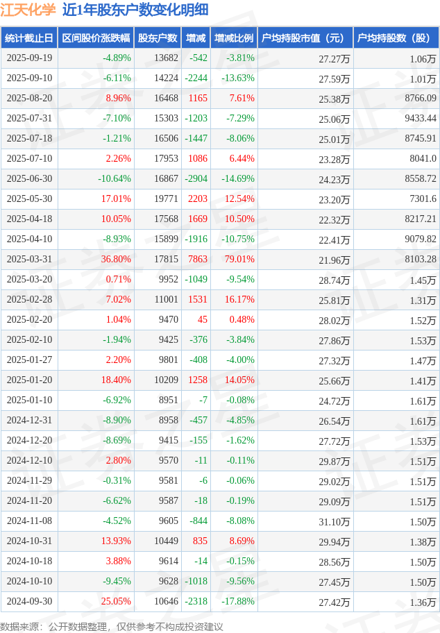 从股价来看,2025年9月10日至2025年9月19日,江天化学区间跌幅为4.89%,在此期间股东户数减少542.0户,减幅为3.81%。