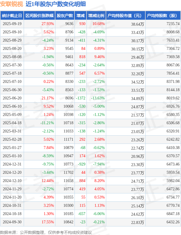 从股价来看,2025年9月10日至2025年9月19日,安联锐视区间涨幅为27.93%,在此期间股东户数增加930.0户,增幅为10.68%。