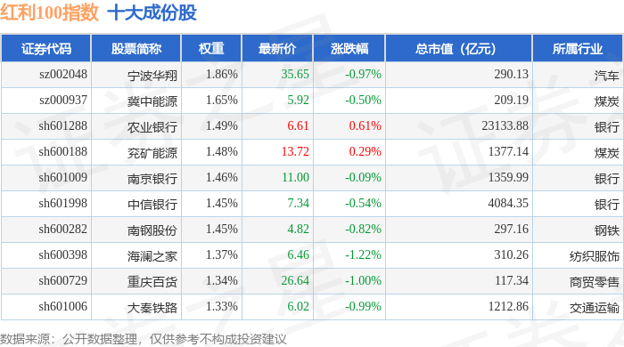 证券之星消息,9月25日,红利100(399411)指数报收于3402.13点,跌0.72%,成交401.34亿元,换手率0.33%。当日该指数成份股中,上涨的有11家,养元饮品以10.02%的涨幅领涨,下跌的有87家,宇通客车以4.1%的跌幅领跌。