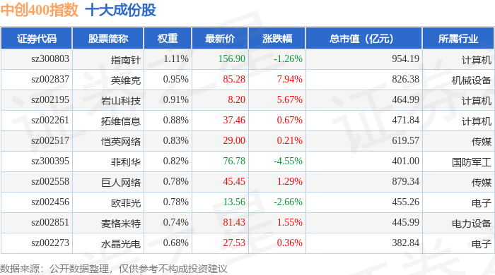 证券之星消息,9月25日,中创400(399624)指数报收于2547.1点,跌0.03%,成交3316.64亿元,换手率3.51%。当日该指数成份股中,上涨的有144家,奥赛康以10.02%的涨幅领涨,下跌的有250家,广东建工以7.93%的跌幅领跌。