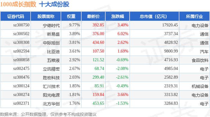 1000成长(399630)指数十大成份股详情如下: