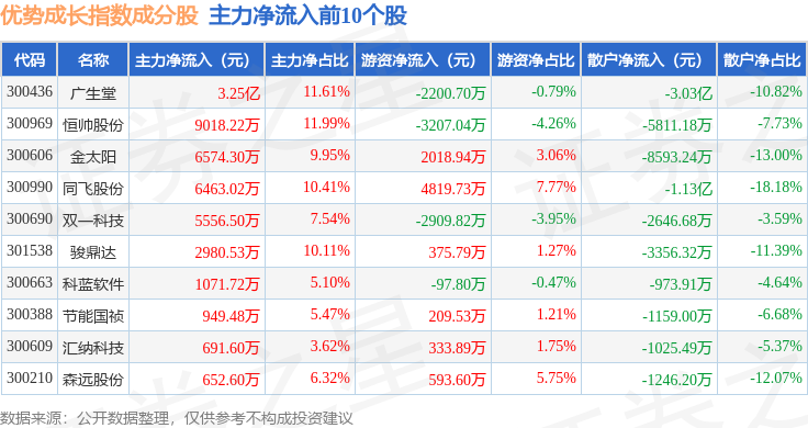 资金流向方面,优势成长(399698)指数成份股当日主力资金净流入合计3.18亿元,游资资金净流入合计1.08亿元,散户资金净流出合计4.26亿元。成份股资金流向详情见下表:
