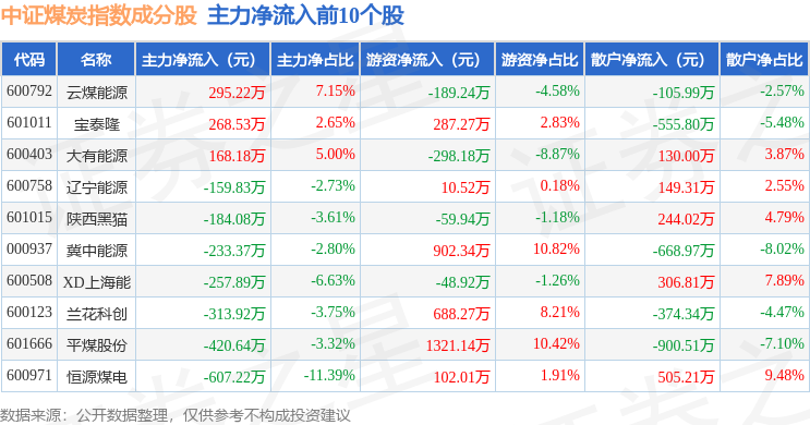 资金流向方面,中证煤炭(399998)指数成份股当日主力资金净流出合计4.57亿元,游资资金净流入合计2.46亿元,散户资金净流入合计2.11亿元。成份股资金流向详情见下表: