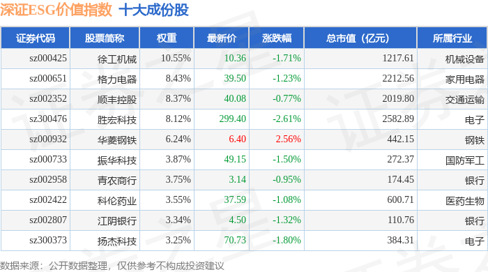 证券之星消息,9月25日,深证ESG价值(970061)指数报收于1639.23点,跌1.01%,成交400.85亿元,换手率1.91%。当日该指数成份股中,上涨的有9家,七匹狼以10.0%的涨幅领涨,下跌的有41家,广东建工以7.93%的跌幅领跌。