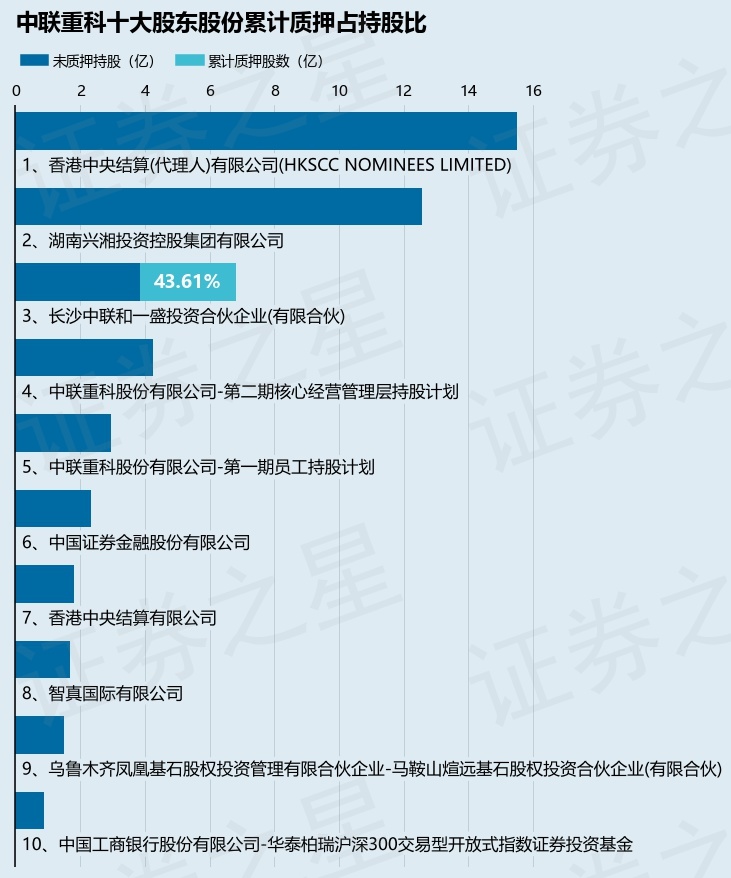 截止本公告日,股东长沙中联和一盛投资合伙企业(有限合伙)已累计质押股份2.98亿股,占其持股总数的43.61%。本次质押后中联重科十大股东的累计质押股份占持股比例(占持股比例的计算以公司最新一期财务报表公布的十大股东的持股总数为基准)见下图: