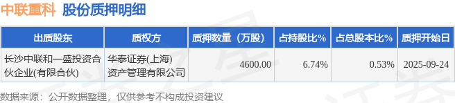 证券之星消息,中联重科(000157)9月25日公开信息显示,股东长沙中联和一盛投资合伙企业(有限合伙)向华泰证券(上海)资产管理有限公司合计质押4600.0万股,占总股本0.53%。质押详情见下表: