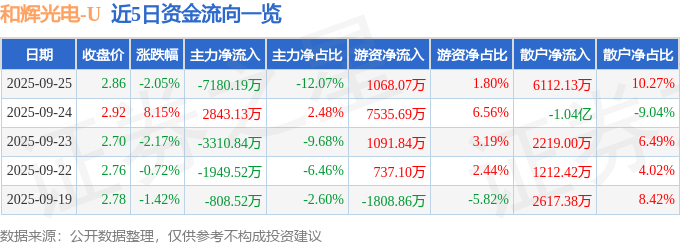 证券之星消息,截至2025年9月25日收盘,和辉光电(688538)报收于2.86元,下跌2.05%,换手率3.61%,成交量207.79万手,成交额5.95亿元。