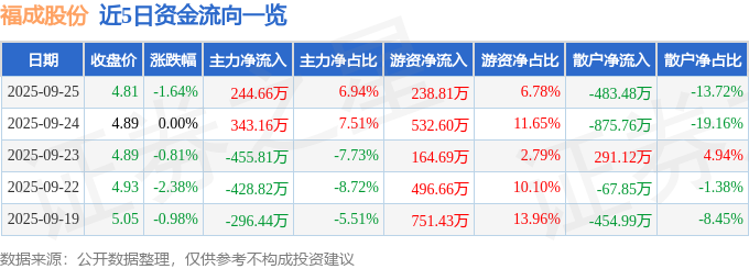 证券之星消息,截至2025年9月25日收盘,福成股份(600965)报收于4.81元,下跌1.64%,换手率0.89%,成交量7.28万手,成交额3523.28万元。