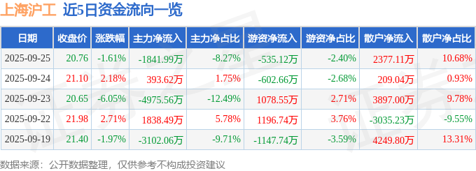 9月25日的资金流向数据方面,主力资金净流出1841.99万元,占总成交额8.27%,游资资金净流出535.12万元,占总成交额2.4%,散户资金净流入2377.11万元,占总成交额10.68%。