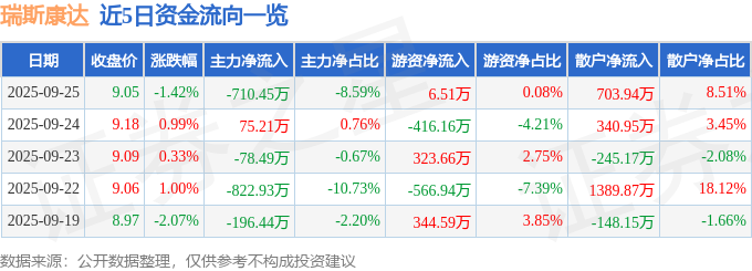 证券之星消息,截至2025年9月25日收盘,瑞斯康达(603803)报收于9.05元,下跌1.42%,换手率2.14%,成交量9.1万手,成交额8267.24万元。