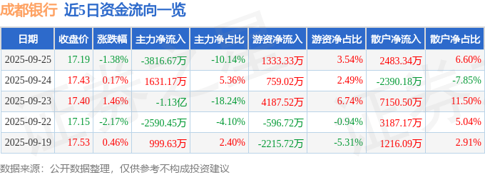证券之星消息,截至2025年9月25日收盘,成都银行(601838)报收于17.19元,下跌1.38%,换手率0.52%,成交量21.84万手,成交额3.76亿元。