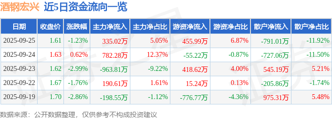 证券之星消息,截至2025年9月25日收盘,酒钢宏兴(600307)报收于1.61元,下跌1.23%,换手率0.66%,成交量41.09万手,成交额6635.41万元。